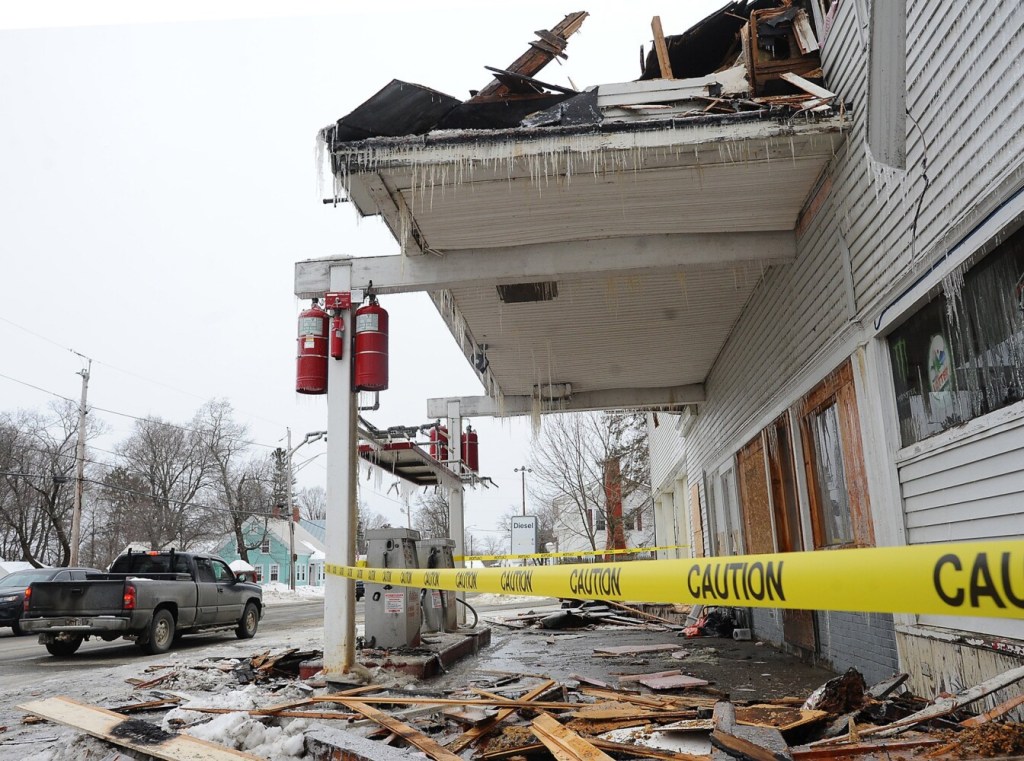 Some of the damage Monday to the roof and rear of Tracey’s Variety at 306 Main St. in Bingham. The variety store and gas station was destroyed by fire late Sunday. Rich Abrahamson/Morning Sentinel Buy this Photo