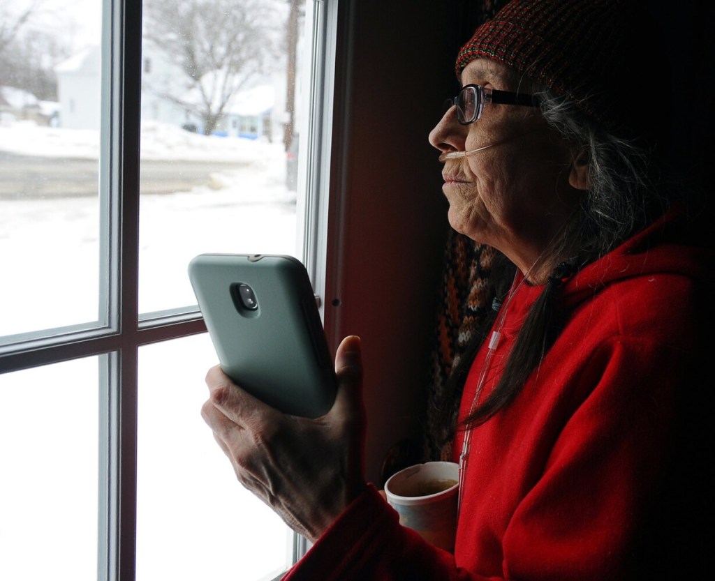 Diane Pooler looks out the window from which she filmed a fire Sunday night at Tracey’s Variety at 306 Main St. in Bingham. Pooler lives across the street from the variety store and gas station. Rich Abrahamson/Morning Sentinel Buy this Photo