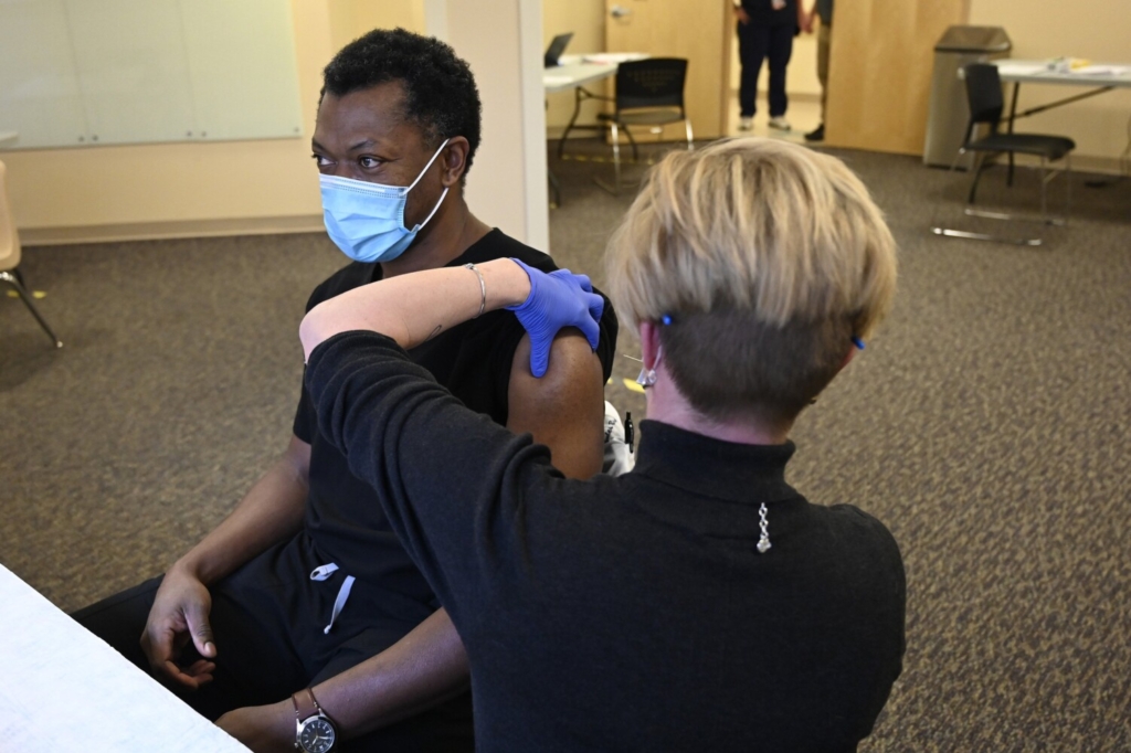 Dr. Jules Bodo is prepped to receive a COVID-19 vaccination at Rumford Hospital, part of the Central Maine Healthcare network, by Bobbie Olsen, a registered nurse, in December. As of Monday, 12.98 percent of Maine’s 1.3 million people had received their first dose. Shawn Patrick Ouellette/Staff Photographer