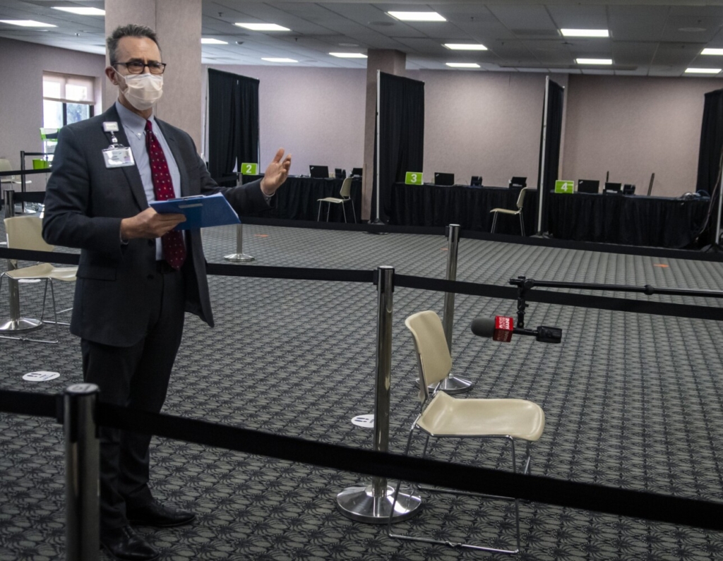 Alex Sydnor, MaineGeneral Health chief strategy officer, leads a tour Wednesday of the COVID-19 mass vaccination site at the Augusta Civic Center. Joe Phelan/Kennebec Journal Buy this Photo