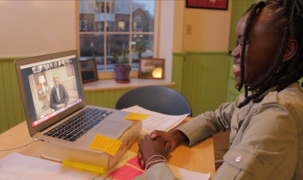 Hipai Pamba, co-teacher and graduate of the Young Writers & Leaders Program at the Telling Room, participates in a Zoom call with former President Barack Obama. “I was enlightened by what he had to say,” Pamba says. Photo courtesy of the Telling Room