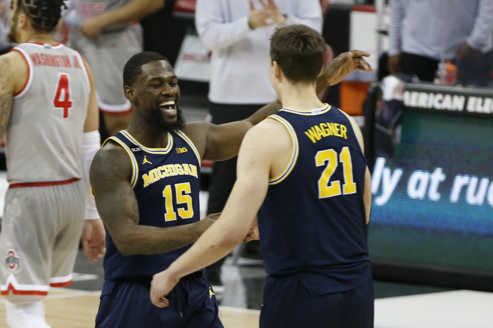 Michigan’s Chaundee Brown, left, and Franz Wagner celebrates their win over Ohio State on Sunday in Columbus, Ohio. Jay LaPrete/Associated Press