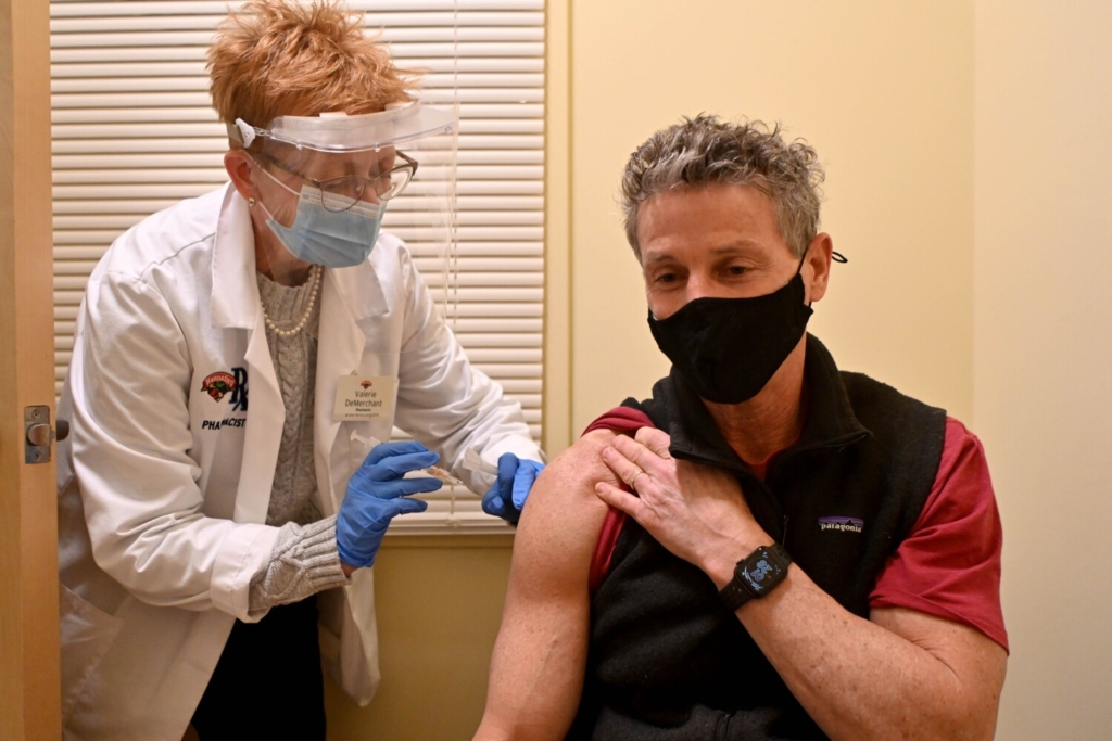 Valerie DeMerchant, a Hannaford pharmacist at Elm Plaza in Waterville, injects James Merrill of Yarmouth with the Johnson & Johnson single-dose COVID-19 vaccine on Friday. Michael G. Seamans/Morning Sentinel