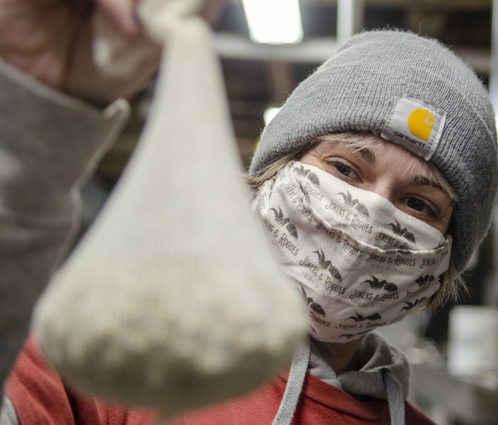 Melissa Rose holds up a bag of Challenger hops that will be boiled in making a batch of wit beer Monday at Jokers And Rogues in Gardiner. Joe Phelan/Kennebec Journal Buy this Photo
