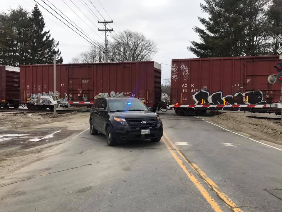 A Pan Am Railways train blocks Pleasant Street in Oakland on Tuesday morning. Photo from Oakland Police Department Facebook page