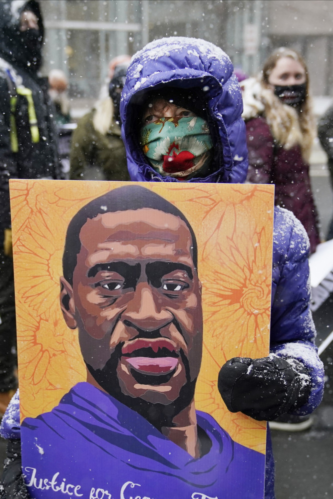 A protester carries a portrait of George Floyd during a protest march around the Hennepin County Government Center on Monday in Minneapolis. Jim Mone/Associated Press file