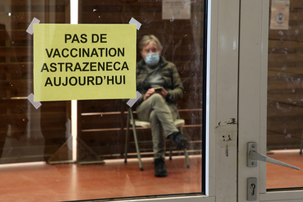 A man waits in a vaccination center where a sign reads “No AstraZeneca vaccinations today” in Saint-Jean-de-Luz, southwestern France, on Tuesday. Bob Edme/Associated Press