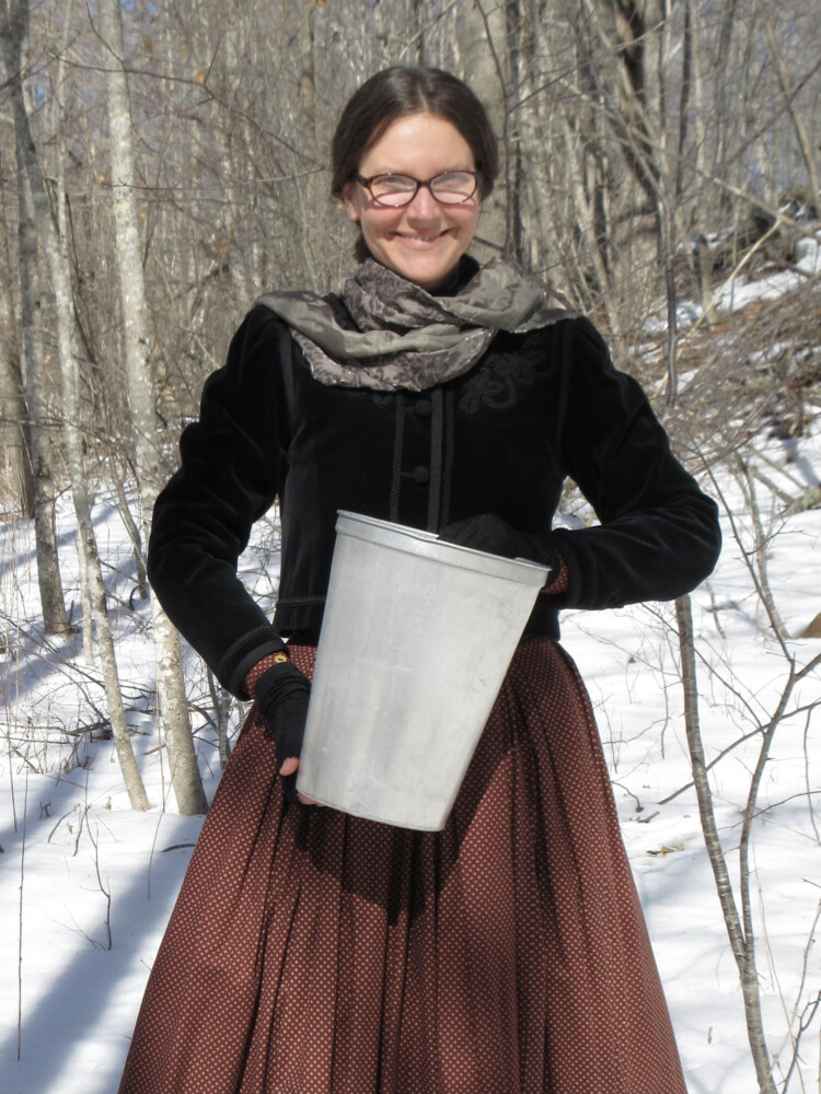 Rachel Bidstrup, Norlands’ new director, dressed in a 19th century costume holding a sap collection pail while standing in a wooded landscape. Contributed photo