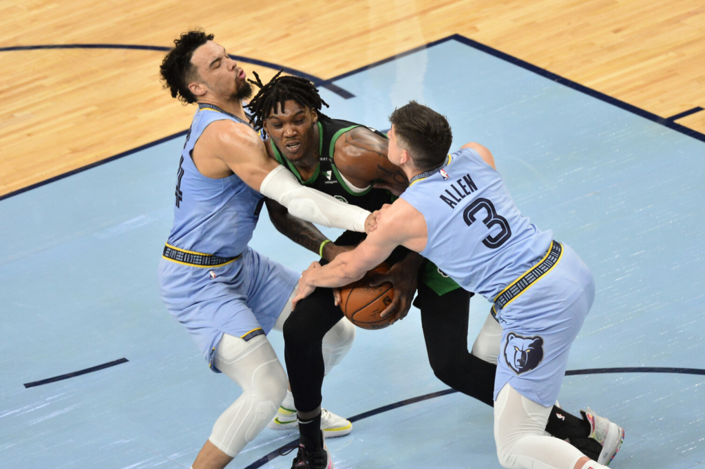 Boston’s Robert Williams III, center, struggles for control of the ball against Memphis guard Grayson Allen, 3, and forward Dillon Brooks in the first half Monday in Memphis, Tenn. Brandon Dill/Associated Press
