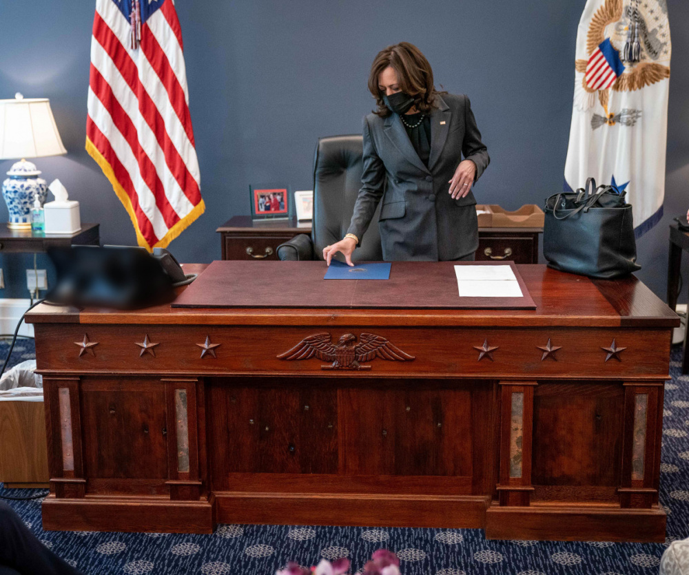 Vice President Kamala Harris stands at the USS Constitution desk. A sailor from Lyman, Donald F. Morse IV, helped build the desk. Official White House Photo by Lawrence Jackson
