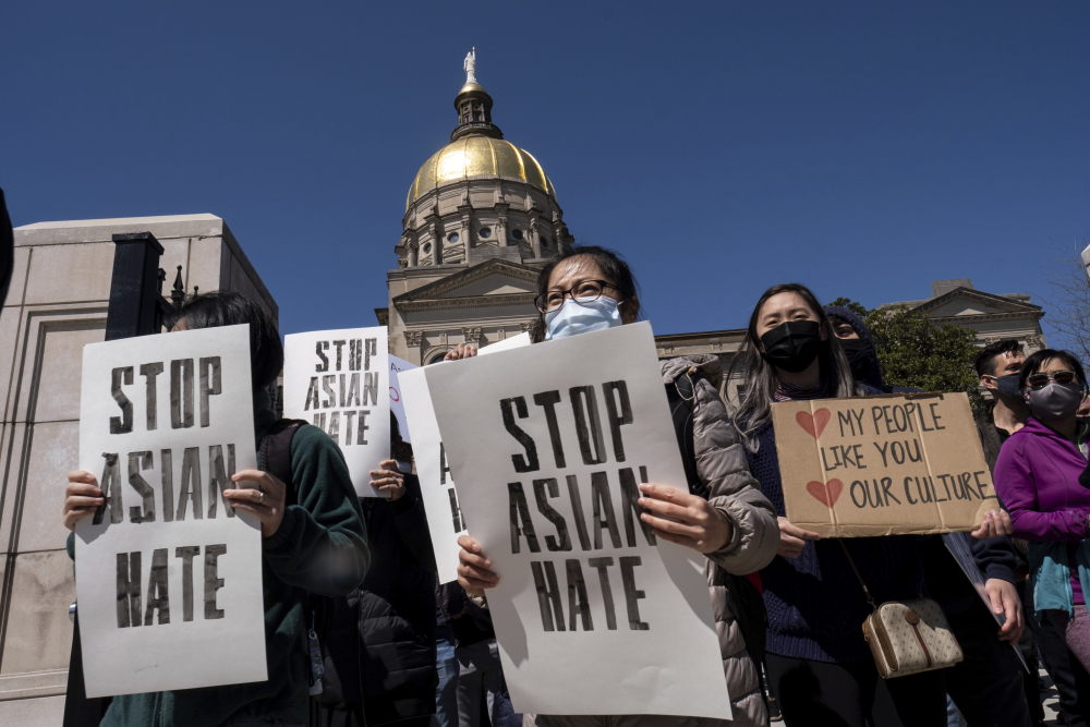 People hold signs while participating in a “stop Asian hate” rally outside the Georgia State Capitol in Atlanta on Saturday afternoon, March 20. AP Photo/Ben Gray