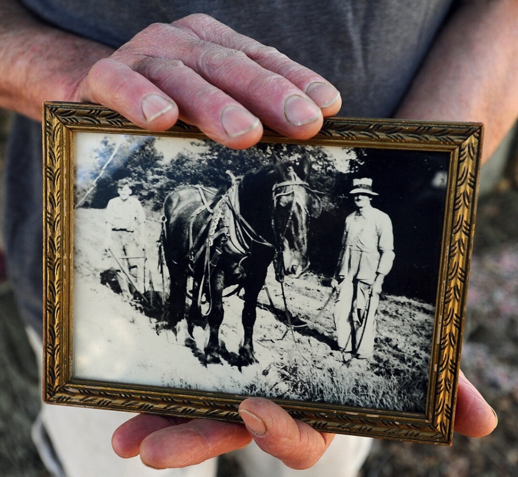 Mark Robie holds a photo from the days of horse-drawn farming at the family farm in Winslow. Shown at the right in the photo is Robie’s great-grandfather, Fred Cushman. Robie and his son, Leon, are hoping to revive the family’s historic farm by starting a marijuana growing operation there. The farm has been in the family about 200 years. Rich Abrahamson/Morning Sentinel Buy this Photo