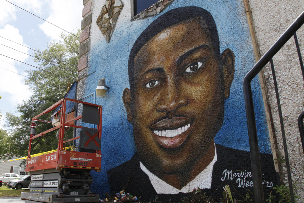 A mural of Ahmaud Arbery is on display in Brunswick, Ga., in May 2020. The 25-year-old man was shot and killed in February. It was painted by Miami artist Marvin Weeks. Sarah Blake Morgan/Associated Press