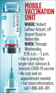 Free Johnson & Johnson COVID-19 vaccinations with no appointment necessary are being given through Wednesday at Robert LaFleur Municipal Airport, at a mobile medical clinic provided by the Federal Emergency Management Agency and Maine Center for Disease Control & Prevention.