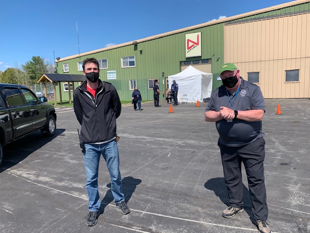 James Segerson, left, a FEMA specialist from New Hampshire, and Patrick Boland, media relations specialist with FEMA, outside the main hangar Monday at Robert LaFleur Municipal Airport in Waterville, the site of a mobile COVID-19 vaccination site. Amy Calder/Morning Sentinel