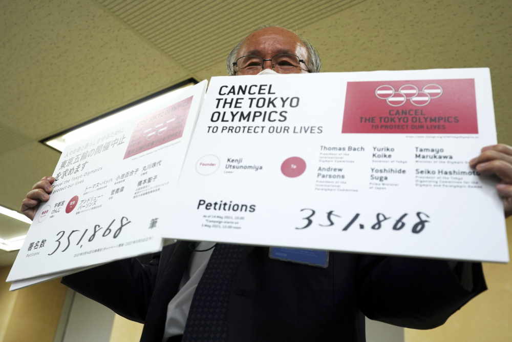 Lawyer Kenji Utsunomiya, a representative of an anti-Olympics group, holds boards showing the current figure of online petition during a press conference after submitting a petition to the Tokyo government calling for the cancellation of the Tokyo 2020 Olympics and Paralympics. The online petition has over 350,000 signatures. Eugene Hoshiko/Associated Press