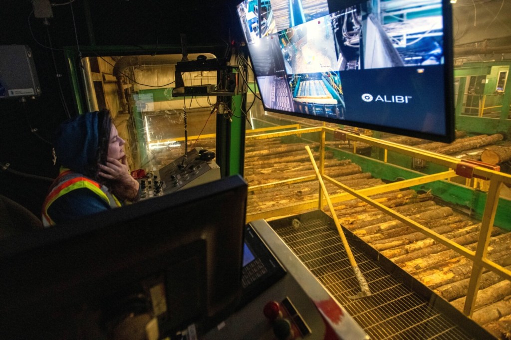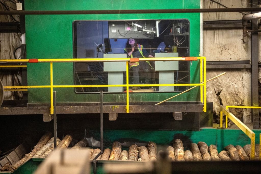 Keri Libby sits in the operator’s cockpit of the de-barker machine at Moose River Lumber in Jackman on Monday May 10. Michael G. Seamans/Morning Sentinel