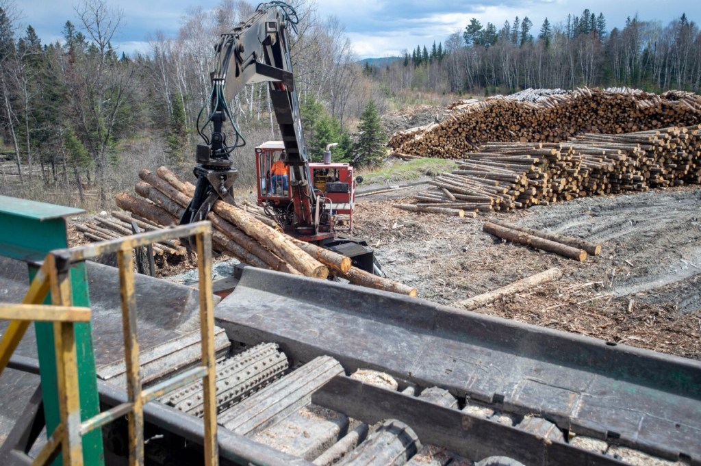 Logs get loaded into a sorting machine to begin the process of becoming various pieces of lumber at Moose River Lumber in Jackman on Monday, May 10. Michael G. Seamans/Morning Sentinel