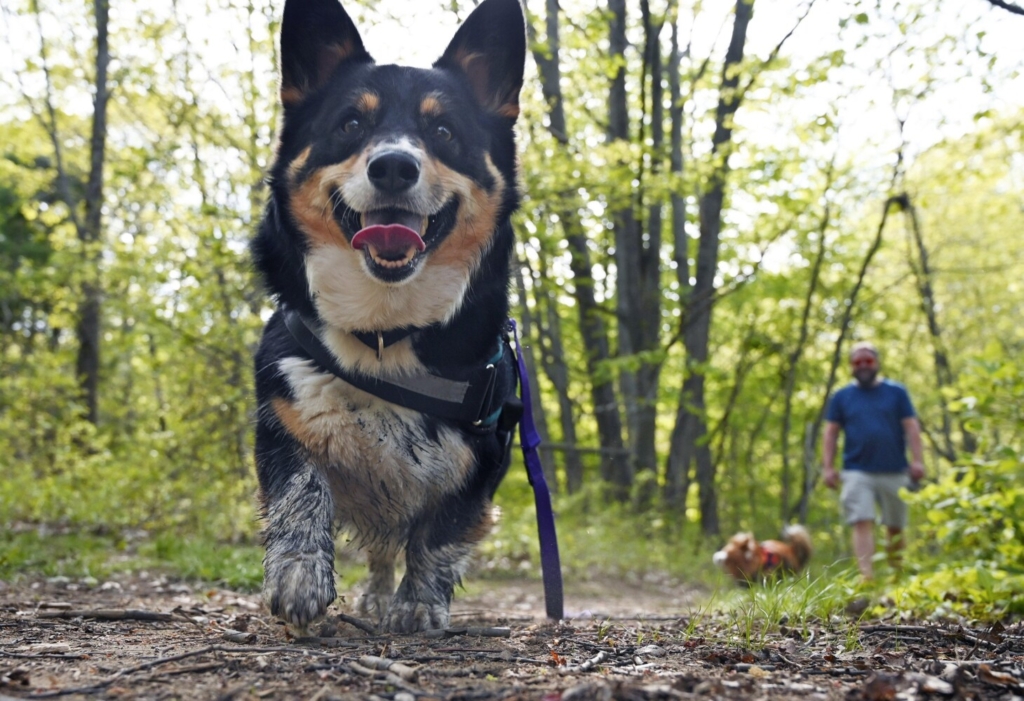 Finnegan leads the way while hiking the trails at Hinckley Park in South Portland on Tuesday. In the background are Matt LaPointe of South Portland and his other dog, Augie. ShawnPatrick Ouellette/Staff Photographer