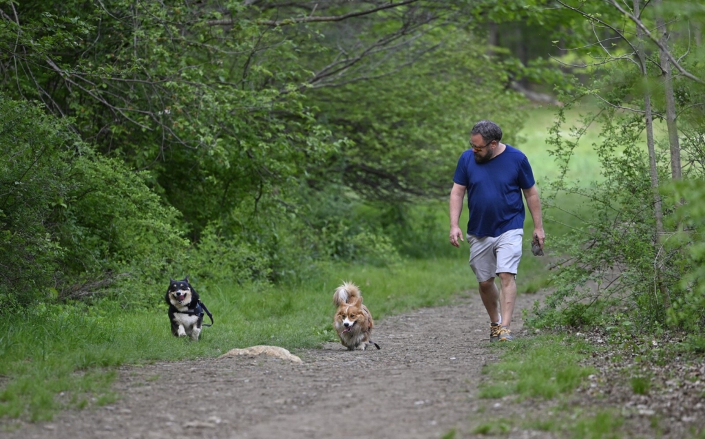 Matt LaPointe of South Portland walks along a trail in Hinckley Park in South Portland along with his dogs Finnegan, left, and Augie on Tuesday. LaPointe says he often has to pick ticks off the two after a hike. Shawn Patrick Ouellette/Staff Photographer
