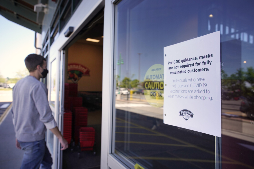 A customer walks into a Hannaford store in Portland on Monday, passing a sign telling customers who are fully vaccinated that they no longer need to wear masks inside the store. Gregory Rec/Staff Photographer Buy this Photo