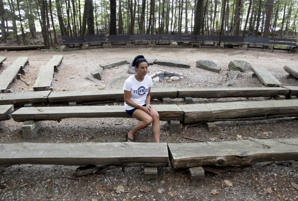 Ellyn Black, the owner of Camp Fernwood, sits by the campfire site Tuesday. Black has been preparing the camp for the arrival of campers and staff later this month. Derek Davis//Staff Pho