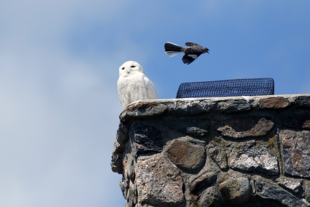 A northern mockingbird harasses the snowy owl perched on a chimney in the Wells on Wednesday. The bird-watching community has named the owl “Snowball.” Ben McCanna/Staff Photographer
