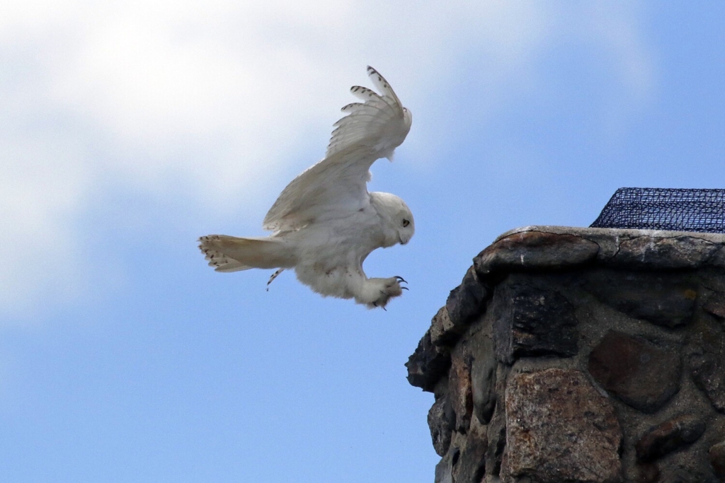 The snowy owl alights on its perch on a chimney in the Drakes Island neighborhood in Wells on Wednesday. Ben McCanna/Staff Photographer