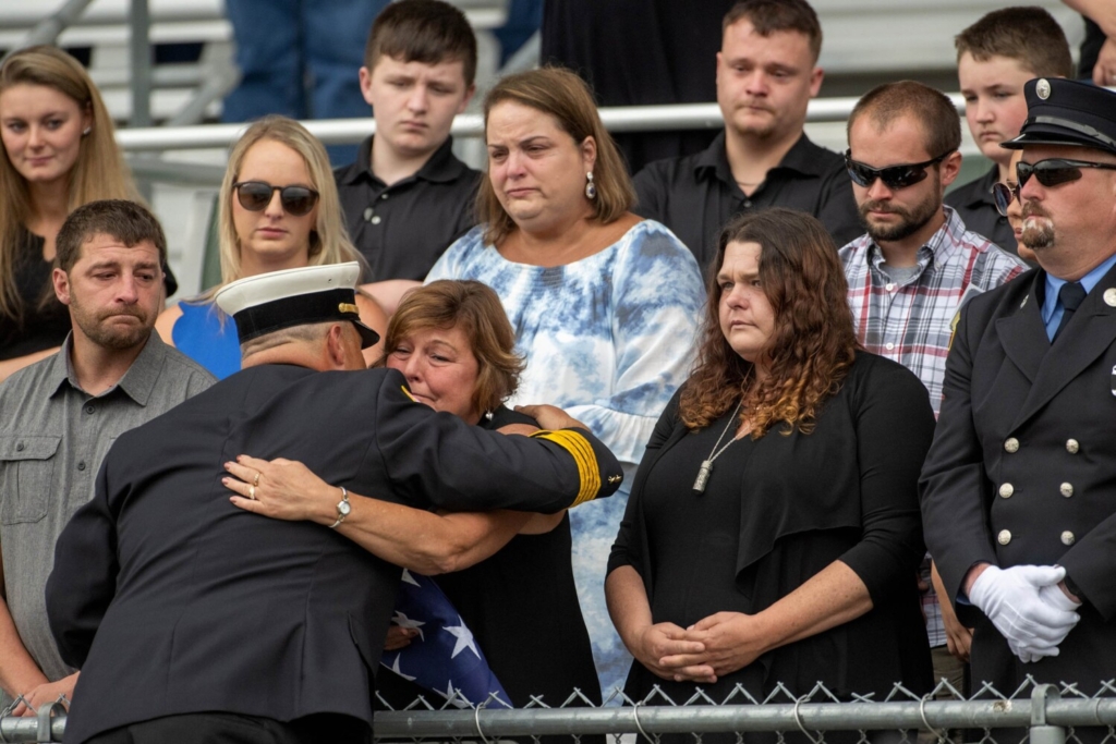 Sheryl Keene receives an American flag in honor of her late husband, Tom Keene, during a memorial service Saturday, June 26, for the former Skowhegan Fire Chief at the Skowhegan Fairgrounds. Michael G. Seamans/Morning Sentinel