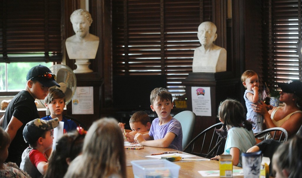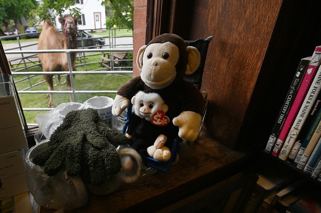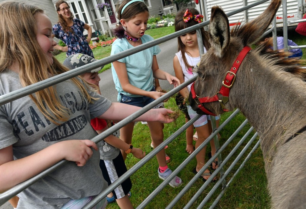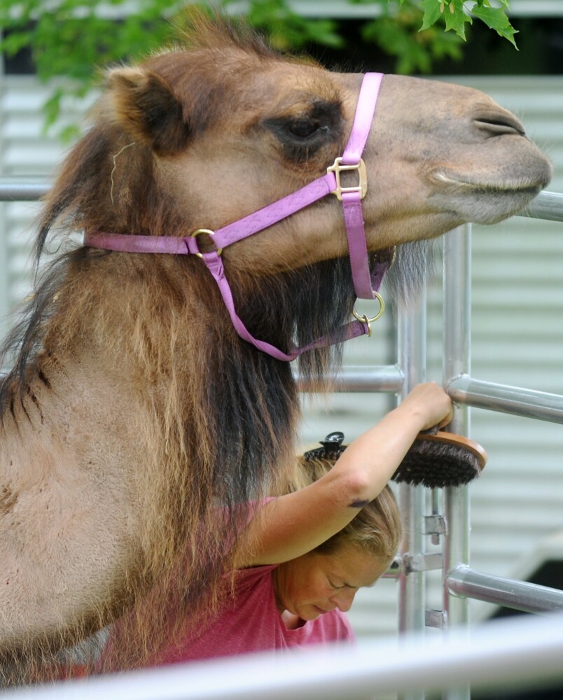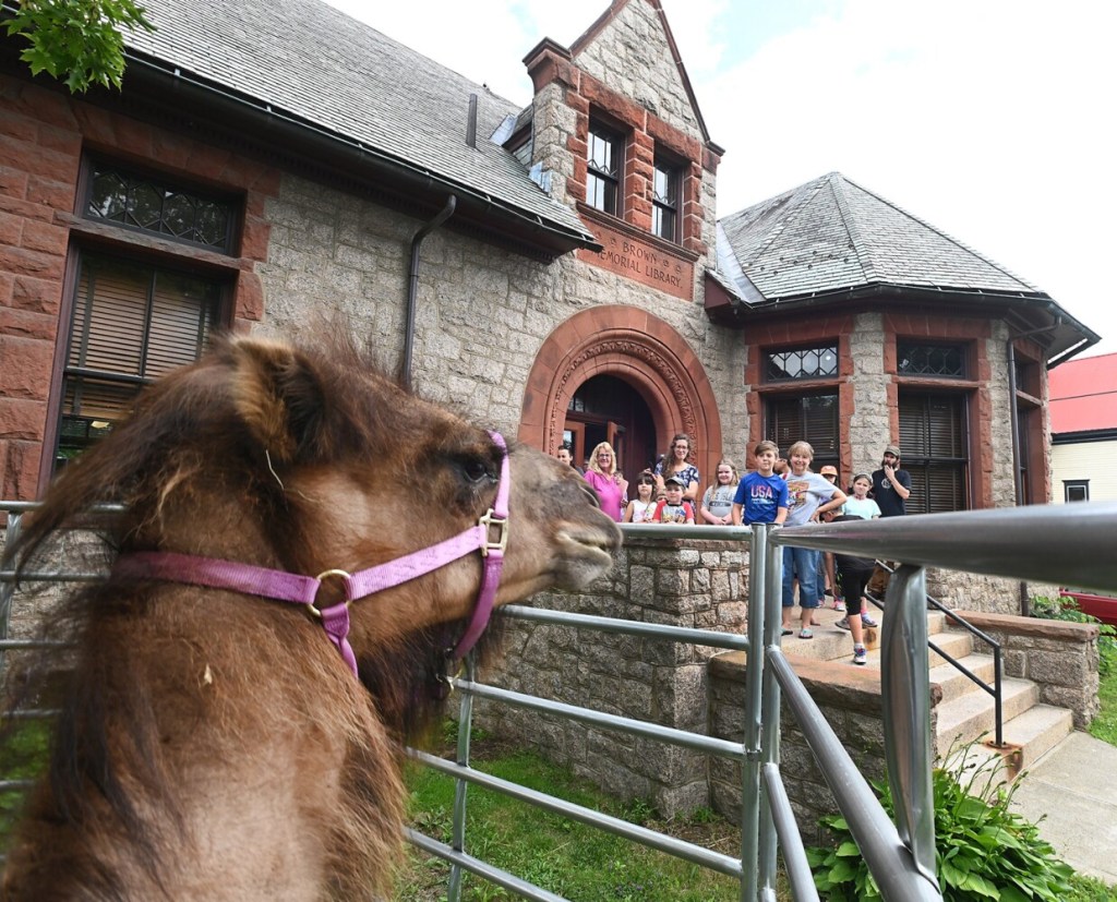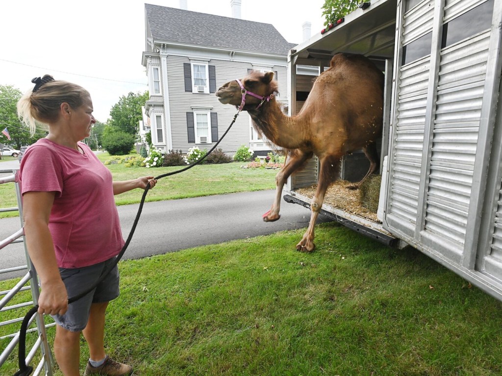 Caesar, a 2,500-pound camel, is guided out of a trailer Wednesdy by Candis Veilleux of Pony Xpress Pony Rides and Educational Zoo during the camel's visit to Brown Memorial Library in Clinton. Caesar and miniature donkey Eeyore visited during a celebration of the library's summer reading program "Tails & Tales." About 35 parents, kids and library staff were on hand for the animals. Rich Abrahamson/Morning Sentinel
