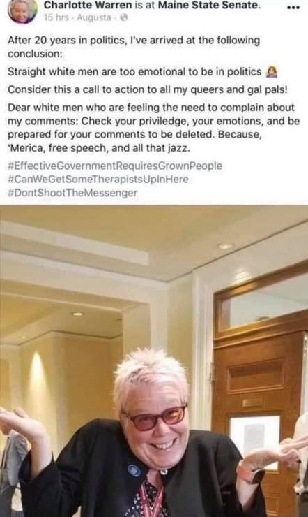 “After 20 years in politics, I’ve arrived at the following conclusion: Straight white men are too emotional to be in politics. Consider this a call to action to all my queers and gal pals! Dear white men who are feeling the need to complain about my comments: Check your priviledge (sic) your emotions, and be prepared for your comments to be deleted. Because, ‘Merica, free speech and all that jazz. #EffectiveGovernmentRequiresGrownPeople #CanWeGetSomeTherapistsUpInHere #DontShootTheMessenger”
