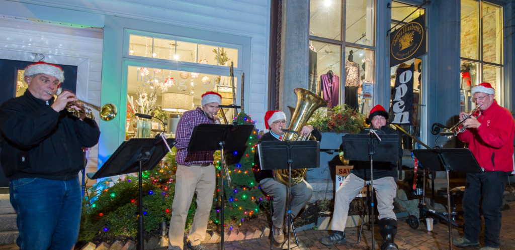 In 2017, Downeast Brass played during Wiscasset Holiday Marketfest on the sidewalks in freezing temperatures. Hear them play in warmer weather from 5 to 8 p.m. Thursday, July 29, during Wiscasset Art Walk. Photo by Bob Bond