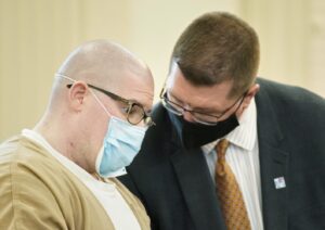 Dustan Bentley, who pleaded guilty to murdering his roommate William Popplewell in Old Orchard Beach, listens to his attorney Joseph Mekonis during Bentley’s sentencing hearing in York County Superior Court in Alfred in October 2020. Maine’s high court has upheld the sentencing. Gregory Rec/Staff Photographer