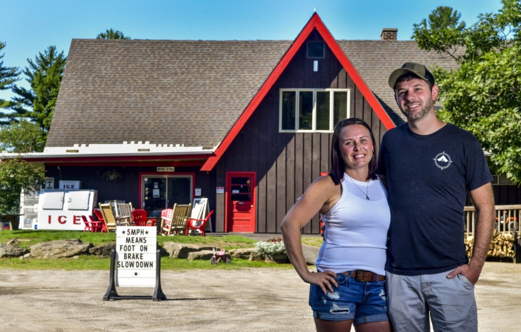 Augusta West Kampground owners Brittany and Kale Malmsten seen Friday outside their home, which is also the Kampground’s store. They are planning to have the A-frame building and other parts of the grounds decorated with holiday lights this winter. Joe Phelan/Kennebec Journal