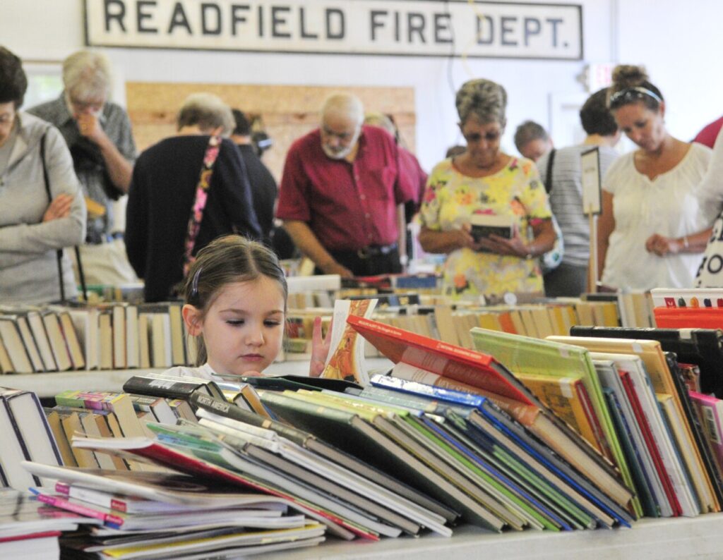 While adults browse in the background, Julia Henderson reads her book during the Readfield Community Library book sale in August 2015, during Readfield Heritage Days. Joe Phelan/Kennebec Journal file