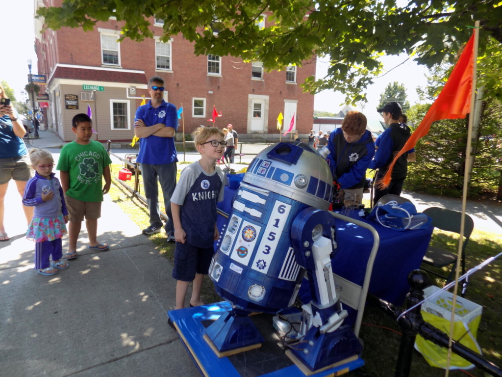 Summer Fest returned to Farmington Saturday with lots of activities for children in Meetinghouse Park. Chandler Clark, centerm of New Sharon takes a closer look at R2Blue2, the mascot of the Mt. Blue High School robotics team. Pam Harnden/Livermore Falls Advertiser