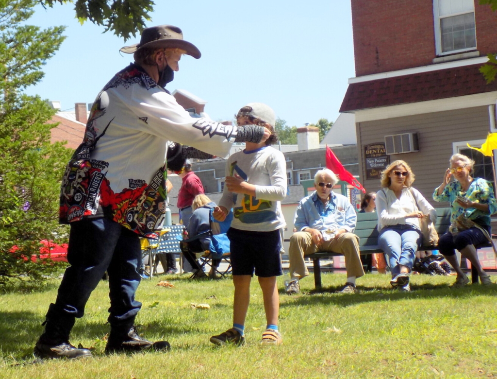 Farmington Summer Fest activities in Meetinghouse Park Saturday afternoon included a talent show. Malcolm Reynolds, left, performs a magic trick with assistance from a member of the audience. Pam Harnden/Livermore Falls Advertiser