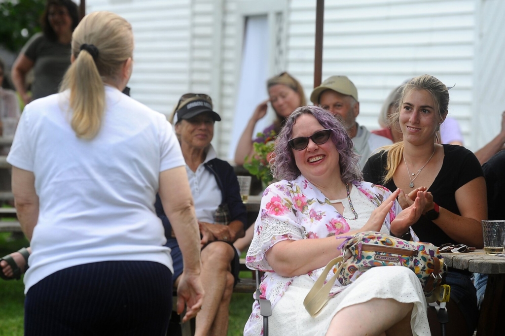Judith Metzger, front right, and others applaud Jan Partridge, left, after Partridge shared memories Sunday of having worked as a waitress and hairdresser at The Village Inn and Tavern in Belgrade Lakes. The event marked the building’s 100th anniversary as an inn. Rich Abrahamson/Morning Sentinel