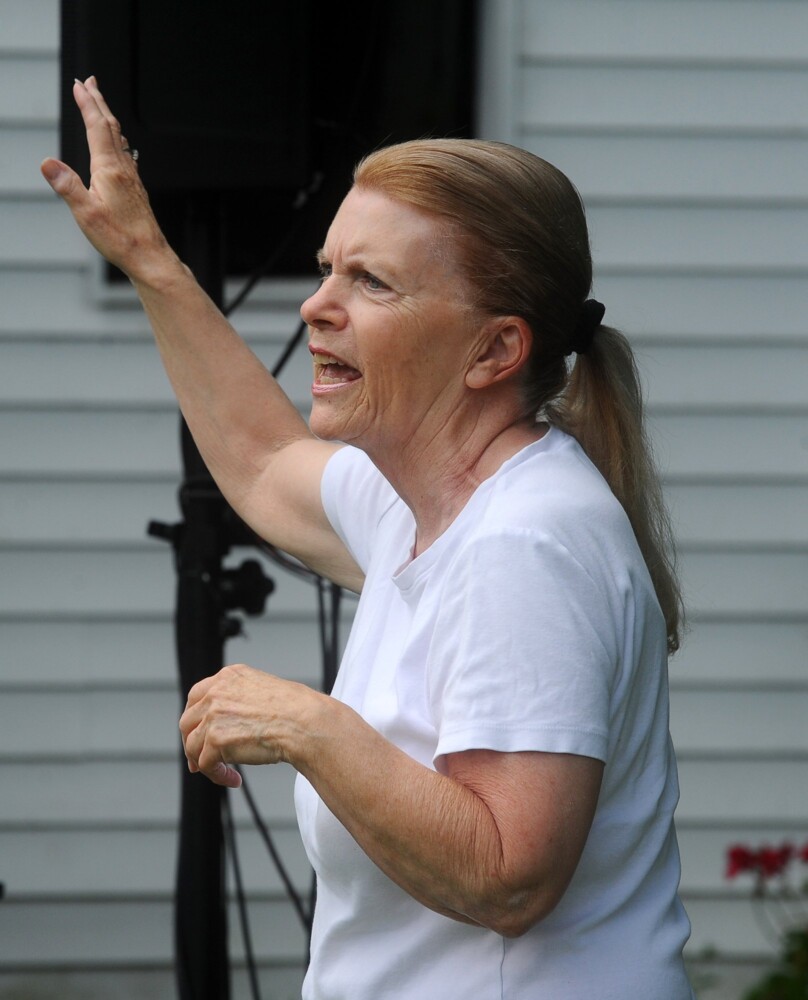 Jan Partridge shares memories Sunday of having worked as a waitress and hairdresser at The Village Inn and Tavern in Belgrade Lakes. Partridge is speaking during a public party marking the building’s 100th anniversary as an inn. Rich Abrahamson/Morning Sentinel