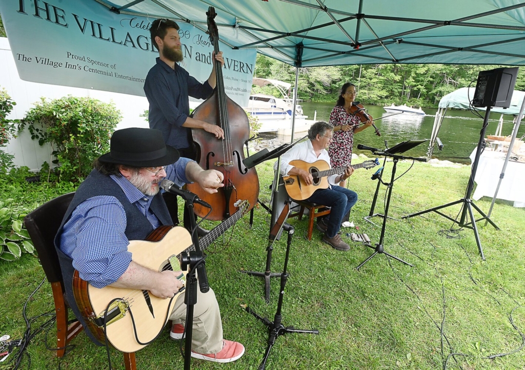 Mes Amis performs Sunday during a public party Sunday at The Village Inn and Tavern in Belgrade Lakes. The event marked the building’s 100th anniversary as an inn. From left: Steve Lynnworth, Ross Gallagher, Harry Richter and Tomoko Iwamoto. Rich Abrahamson/Morning Sentinel