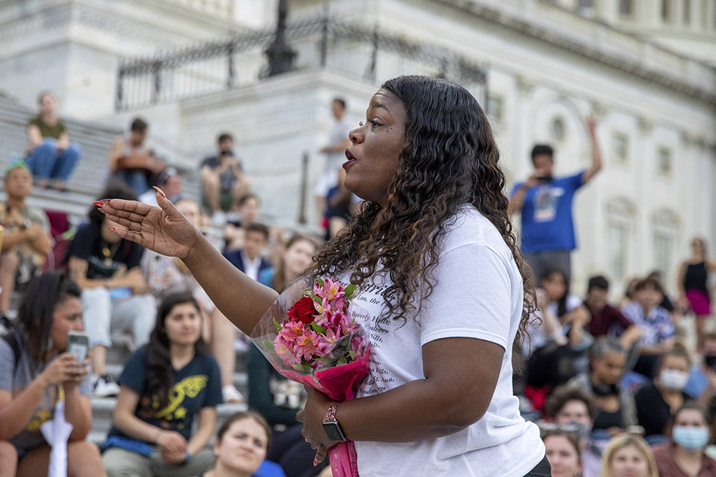 Rep. Cori Bush, D-Mo., speaks to people who staged a sit-in at the Capitol that led to Tuesday’s announcement that the Biden administration will enact a targeted nationwide eviction moratorium. For the past five days, lawmakers and activists primarily led by Bush sat on the steps of the Capitol to protest the expiration of the moratorium. Associated Press/Amanda Andrade-Rhoades