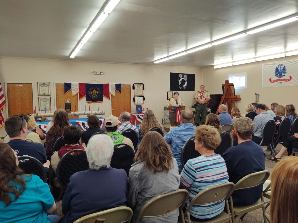 Scoutmaster Karla Talpey and Scout Leader Al Duplessis address the audience during a July 31 Eagle Scout ceremony for Christopher Somerset of Jackman. Contributed photo