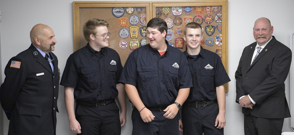 Farmingdale firefighters Zakkary Roy, 17, left, Keegan Bellerose, 16, center, and Aidan Beale, 16, pictured with their officers Michael LaPlante, right, Julian Beale, second from right, and Doug Ebert during a ceremony Tuesday, Aug. 10 at the Farmingdale station to celebrate the teenagers’ new firefighting credentials. Andy Molloy/Kennebec Journal
