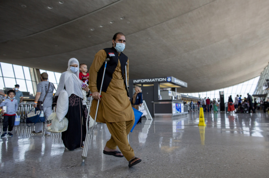 Families evacuated from Kabul, Afghanistan, walk through the terminal to board a bus after they arrived at Washington Dulles International Airport in Virginia on Friday. Associated Press/Gemunu Amarasinghe