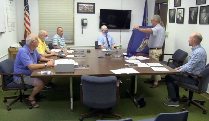 Selectman and Rep. Scott Landry holds a Maine flag he presented Tuesday night to Town Manager Richard Davis who is retiring Aug. 27. Also pictured from left are Selectmen Michael Fogg, Stephan Bunker and Matthew Smith, Davis and Selectman Joshua Bell. Screenshot from video