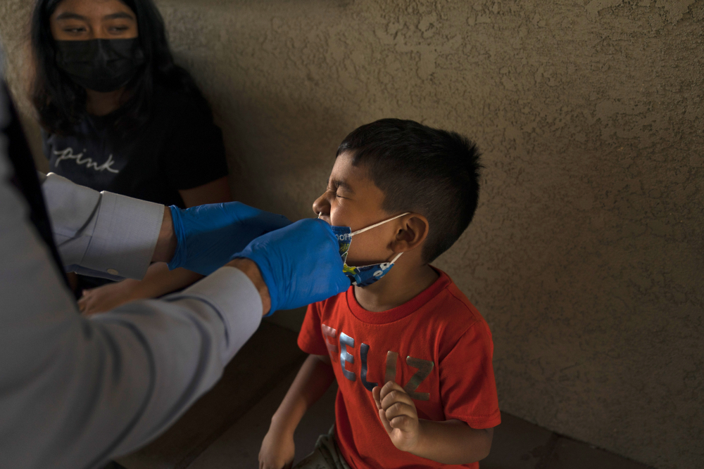 Shahir Sanchez, 5, grimaces as Dr. Neal Schwartz collects a nasal swab sample for COVID-19 testing Thursday in Tustin, Calif. Jae C. Hong/Associated Press