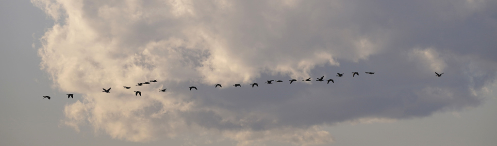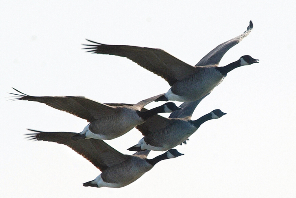 In the Cobscook Bay area recently – near the easternmost part of Maine – I have been hearing the honks of Canada geese. I always look up to see them because I am fascinated by their flight in V-formations. But geese do not have a monopoly on V-formations. Many species of ducks, swans, cormorants, ibises, cranes and even some pelicans show the same behavior.