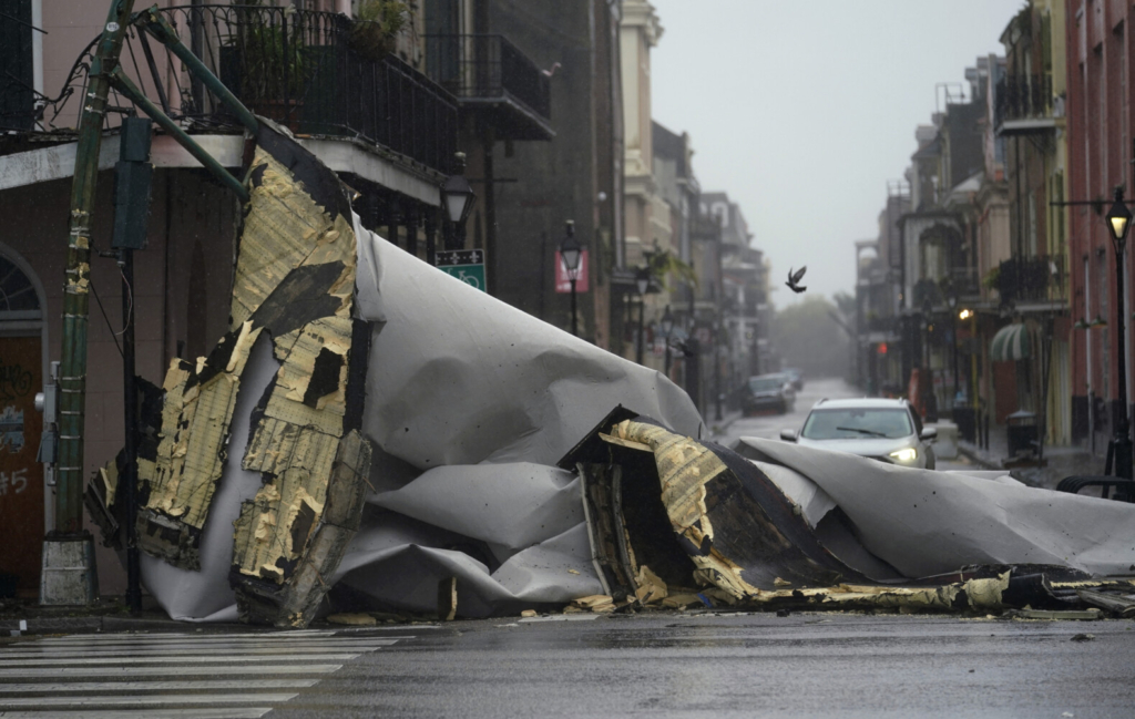 A section of roof that was blown off of a building in the French Quarter by Hurricane Ida’s winds blocks an intersection on Sunday in New Orleans. Eric Gay/Associated Press