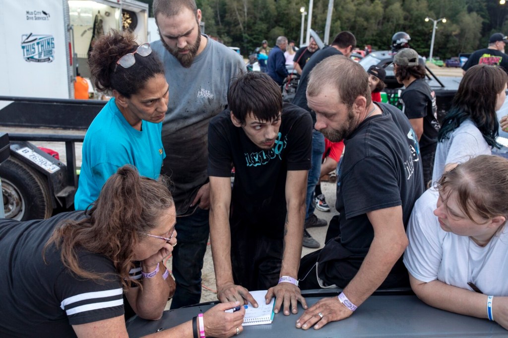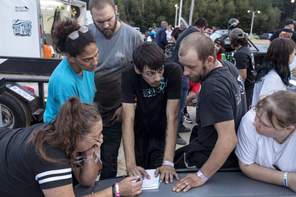 Betty Nelson, second from left, talks with her crew, including her son Josh Nelson, center, about how they will set up her car for Thursday night’s race at Beech Ridge Motor Speedway. Nelson, who is from Limington, started her racing career in the late 1990s at Beech Ridge and said she had to come back to race there again. Brianna Soukup/Staff Photographer