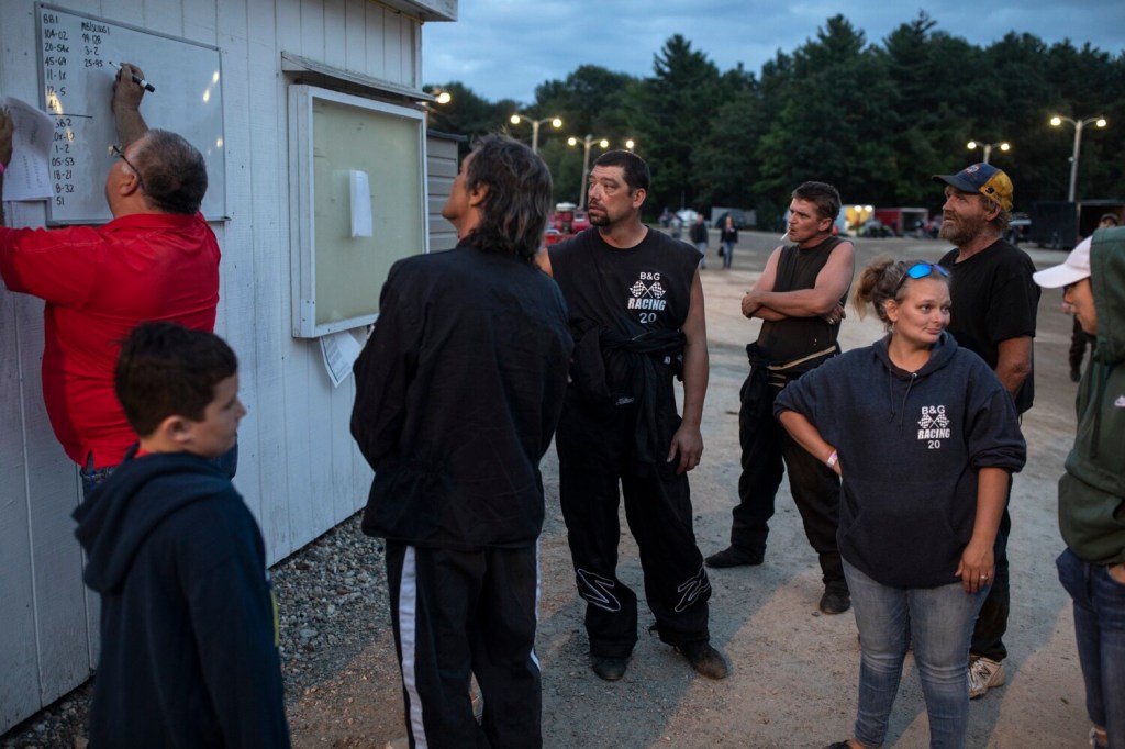 Jeff Read and his son Jackson Read, 14, watch cars round the track before the start of racing Thursday at Beech Ridge Motor Speedway in Scarborough. Read, who lives in Somerville, said he had to come back to Beech Ridge for the last week of racing because it’s where his father won three championships in the late 1950s and early 1960s. He began racing himself in Wiscasset after his father died. Brianna Soukup/Staff Photographer